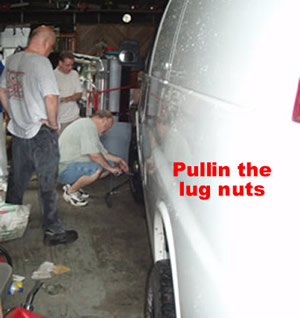 His buds Stick and Mike were there waiting to tear into my van problem. I pulled the van into the pole barn at Mike's next door and in no time I had the wheel of with the air wrench. At this point Stick jumped in and in a few minutes had the brake and rotor off and the wheel bearing assembly was on the ground and a new one waiting at the parts store an hour round trip away.