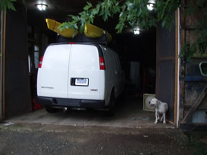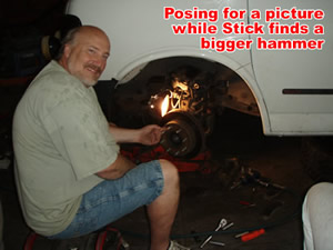 His buds Stick and Mike were there waiting to tear into my van problem. I pulled the van into the pole barn at Mike's next door and in no time I had the wheel of with the air wrench. At this point Stick jumped in and in a few minutes had the brake and rotor off and the wheel bearing assembly was on the ground and a new one waiting at the parts store an hour round trip away.